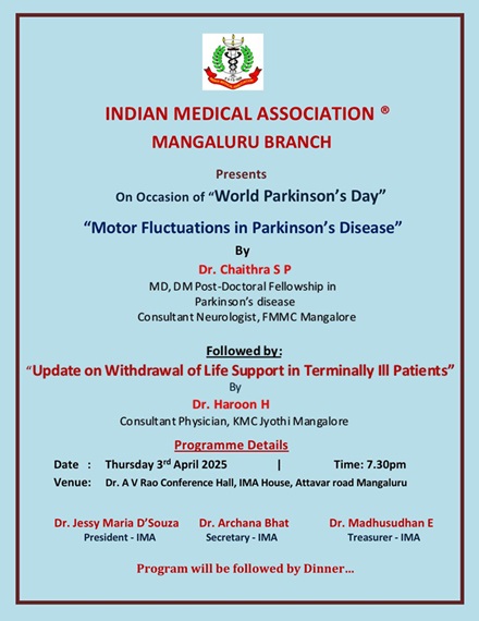 On April 3rd in view of World Parkinson’s Day IMA Mangaluru Branch celebrated Parkinson’s day by a Wonderful CME by Dr Chaithra S P Neurologist Fr. Muller Medical College, Mangalore on Motor Fluctuations in Parkinson’s disease. Dr Chaithra S P emphasized the importance of early recognition of Parkinson’s disease and treatment which can improve the quality of life in patients with Parkinson’s disease.