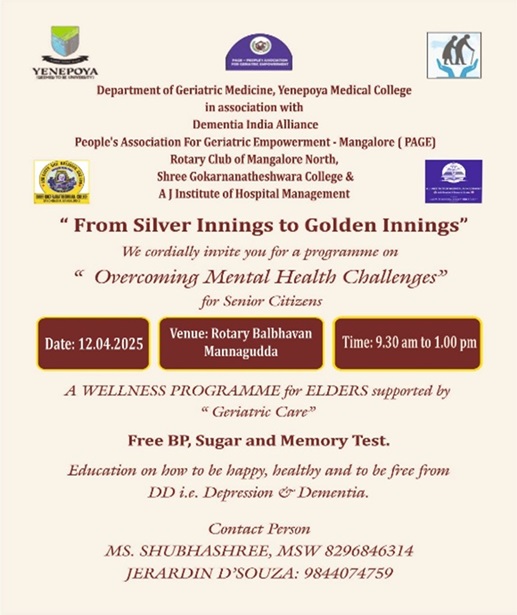 Dr. Prabha Adhikari , Professor and head Department of Geriatric medicine Yenepoya Medical College conducted wellness program “ From silver innings to golden innings “ in collaboration with Dementia India Alliance , PAGE, Rotary club of Mangalore North,, Shree Gokarnathewar College and AJ Institute of Hospital Management on 12th of April. Free BP, sugar and memory testing was also conducted