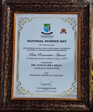 Dr. Sowrabha Bhat, Associate professor, Dept of Endocrinology, YMC has been honored with the Prestigious National Young Academic Excellence Award by IMA National Board for the year 2024 – 25.