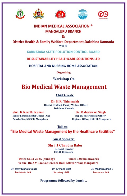 One day workshop for District Surveillance officers and Microbiologist of Karnataka was organised at IMA Hall Hampankatta Mangalore on 21st November 2024 in collaburation with Disrict Public Health liabulatory Dakshina Kannada. Various officers presidede over the function the District Surveillance officer of Dakhina Kannada Introducted the programme. Dr. M Chakrapani, Dr Balamurugan, Mrs. Meena Vijayaraj and Microbiologist attended the programme and spoke on the important of Leptospirosis in the Society. Prevention and early detection of Leptospirosis is very important as there is increasing number of cases of Leptospirosis in our community. Dr. Jessy Maria D’Souza, President IMA Mangaluru Branch presided over the programme.