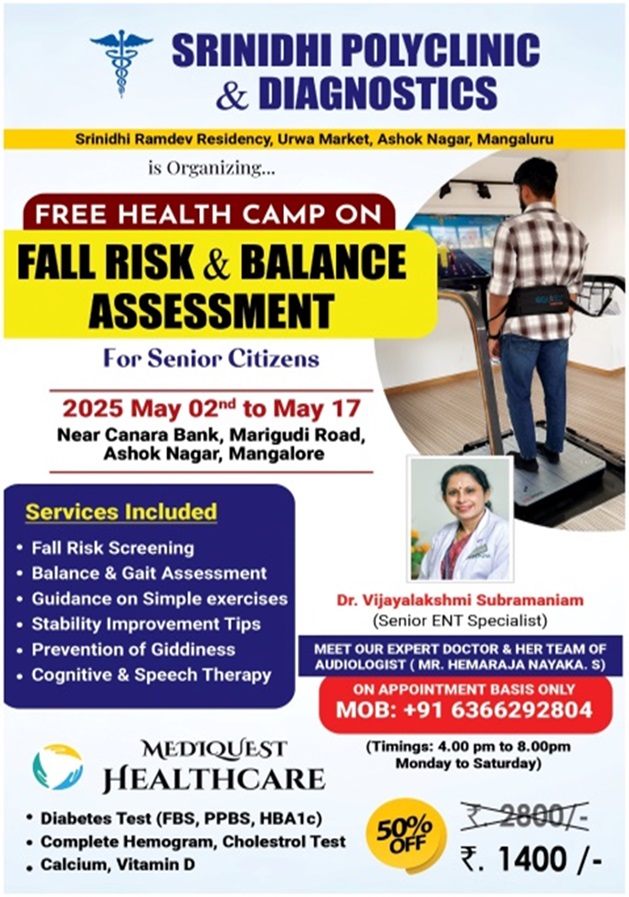 Dr. Vijayalakshmi Subramaniam conducted a free Fall Risk and Balance Assessments for senior citizens in association with Srinidhi polyclinic and diagnostics from 2nd to 17th May, 2025. It was open to all to make use of this opportunity.