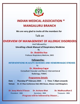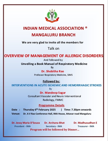 Indian Medical Association, Mangaluru branch and Karavali Dermatology Society (IADVL Karavali) in association with department of Dermatology, Venereology and Leprosy of Yenepoya Medical College, Yenepoya (Deemed to be University) jointly organised CME on Allergy and Immunology was held on June 15th 2025 at A.V. Rao Conference Hall, IMA House, Attavar Road, Mangalore.