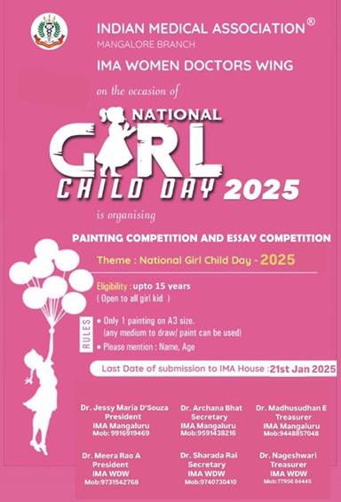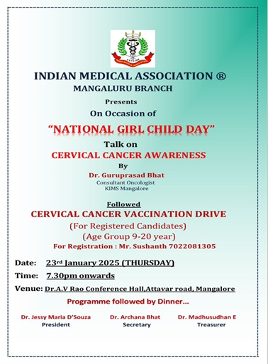 On the occasion of National Girl Child Day IMA Mangaluru Branch hosted a CME on Cervical Cancer Awareness. The speaker for the session was Dr. Guruprasad Bhat, consultant Oncologist, Kanachur Institute of Medical science Mangalore. The function was celebrated on 23rd January 2025, 7.30pm onwards at Dr. A V Rao Conference hall, Mangalore.