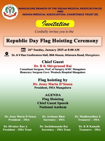 On the mark of Republic Day on 26th January 2025 IMA Mangaluru branch along with IMA Charitable Trust had Republic day Flag hosting ceremony at 8.00am. The chief guest Dr. B K Shivprasad Rai, Consultant Surgeon, Prof of Surgery KMC Mangalore, Honorary Surgeon Govt. Wenlock Hospital, Mangalore. Flag was hosted by Dr. Jessy Maria D ‘Souza, President IMA Mangalore. Following the flag hoisting ceremony the Chief Guest Dr. B k Shivprasad Rai spoke about the importance of constitution in present scenario and the 76th celebration of the Republic day and also he told about the present scenario were the leaders need to follow the simple rules which are done in the constitution. And he told that it is the matter of pride and patriotism for all of this Indians to celebrate our Republic day and need to honour our Nations, Unity in diversity and go ahead towards development and follow about the constitution. Following the chief Guest speech there was vote of thanks by Dr. Archana Bhat, IMA Secretary. All the members saluted the National flag and followed by singing of National Anthem.