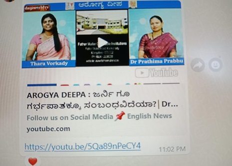 Dr. Prathima Prabhu, consultant Gynecologist gave an awareness talk on Relation between Journey and Abortion at Arogya Deepa session on Daijiworld TV.