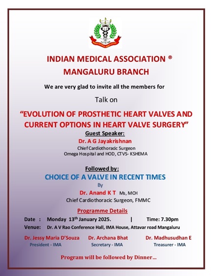 On 13th January 2025, second session Choice of a Valve in Recent Times by Dr. Anand K T, Chief cardiothoracic surgeon, FMMC Mangalore. It was chaired by Dr. P S Bhat. It was followed by an interactive question and answer session. There were active participants around 50 in number for this monthly meeting and it was followed by dinner.