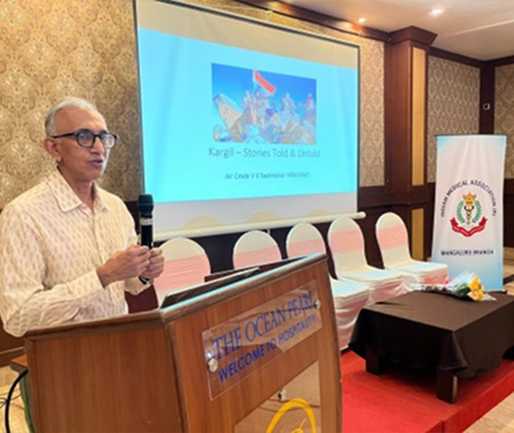 On 17th July 2025, IMA Mangaluru Branch celebrated “KARGIL VIJAY DIWAS 2025” Air commander, Dr. V K Sashindran, Professor, Dept of Medicine, KSHEMA gave a talk on the bravery of the Soldiers who fought the Kargil War. He remembers the nobles sacrificed done the soldiers and the importance of remembering the martyrs.