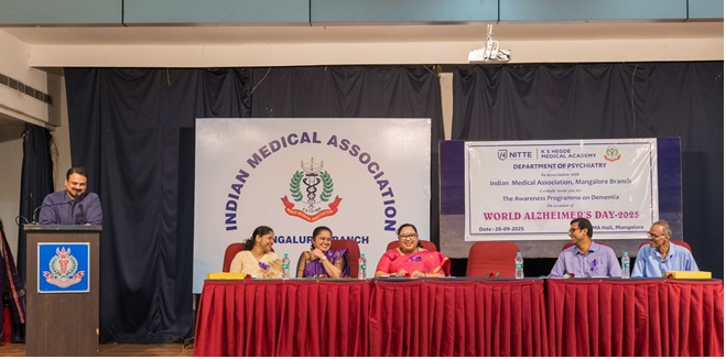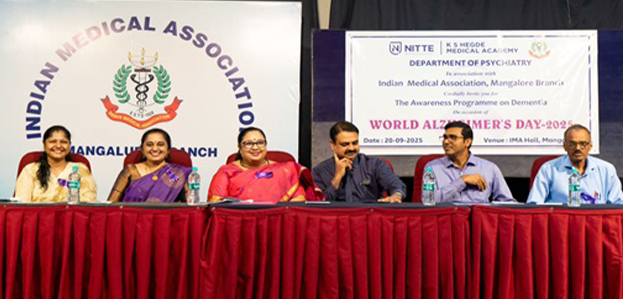 On 20th September 2025, the Dept of Psychiatry in association with IMA Mangaluru Branch organised “World Alzheimer’s Day programme”. Dr. Jessy Maria D’Souza, President IMA Mangaluru branch was the chief Guest and Dr. Sandeep Rai, Dean, K S Hegde Medical Academy, Mangaluru presided the programme.